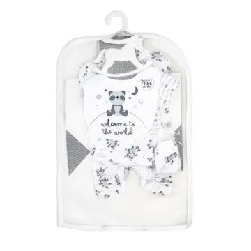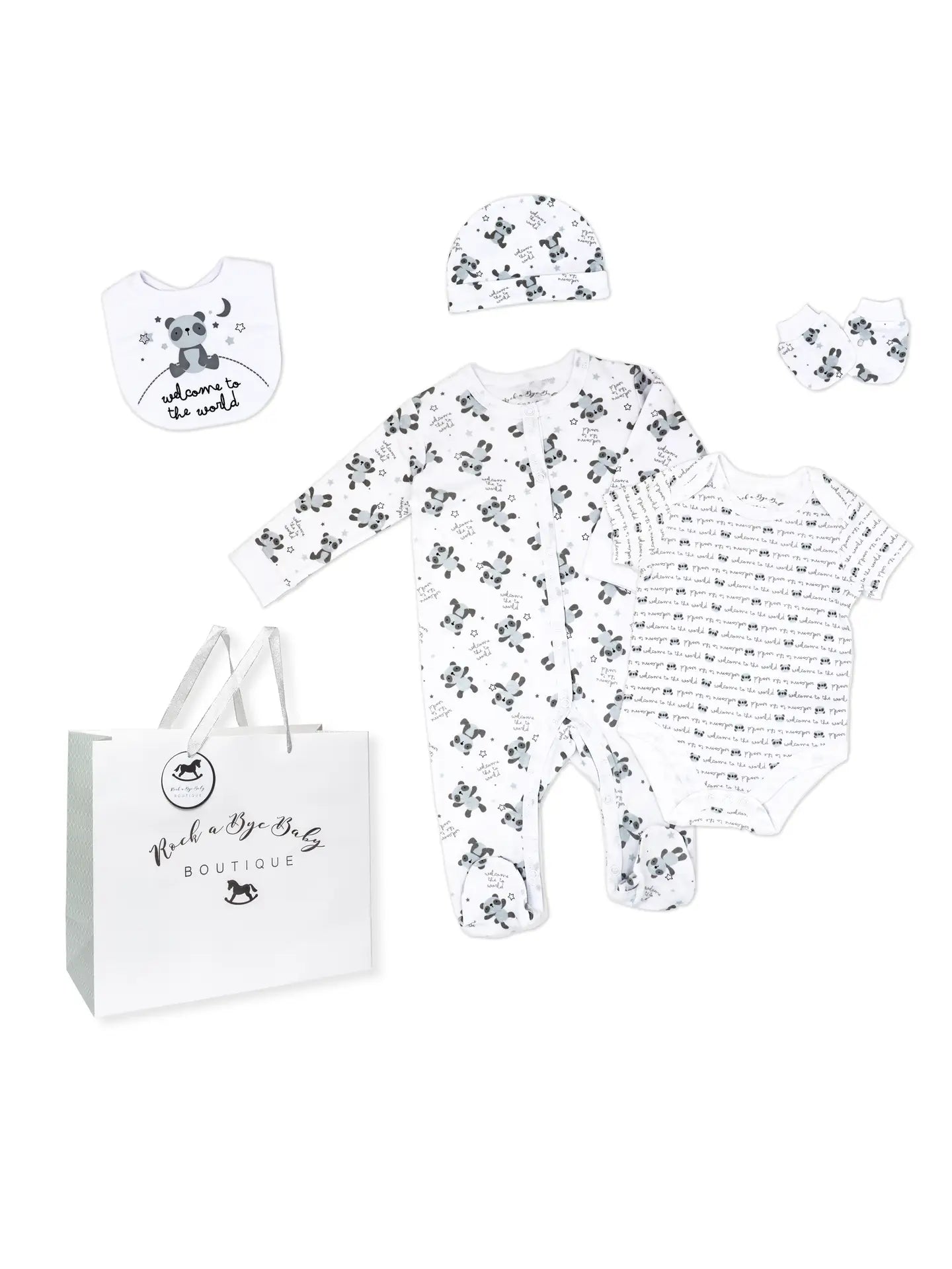 Set includes: Sleeper, Bodysuit, Hat, Mitts, and Bib Packed in Organza Mesh Bag with Gift bag Included