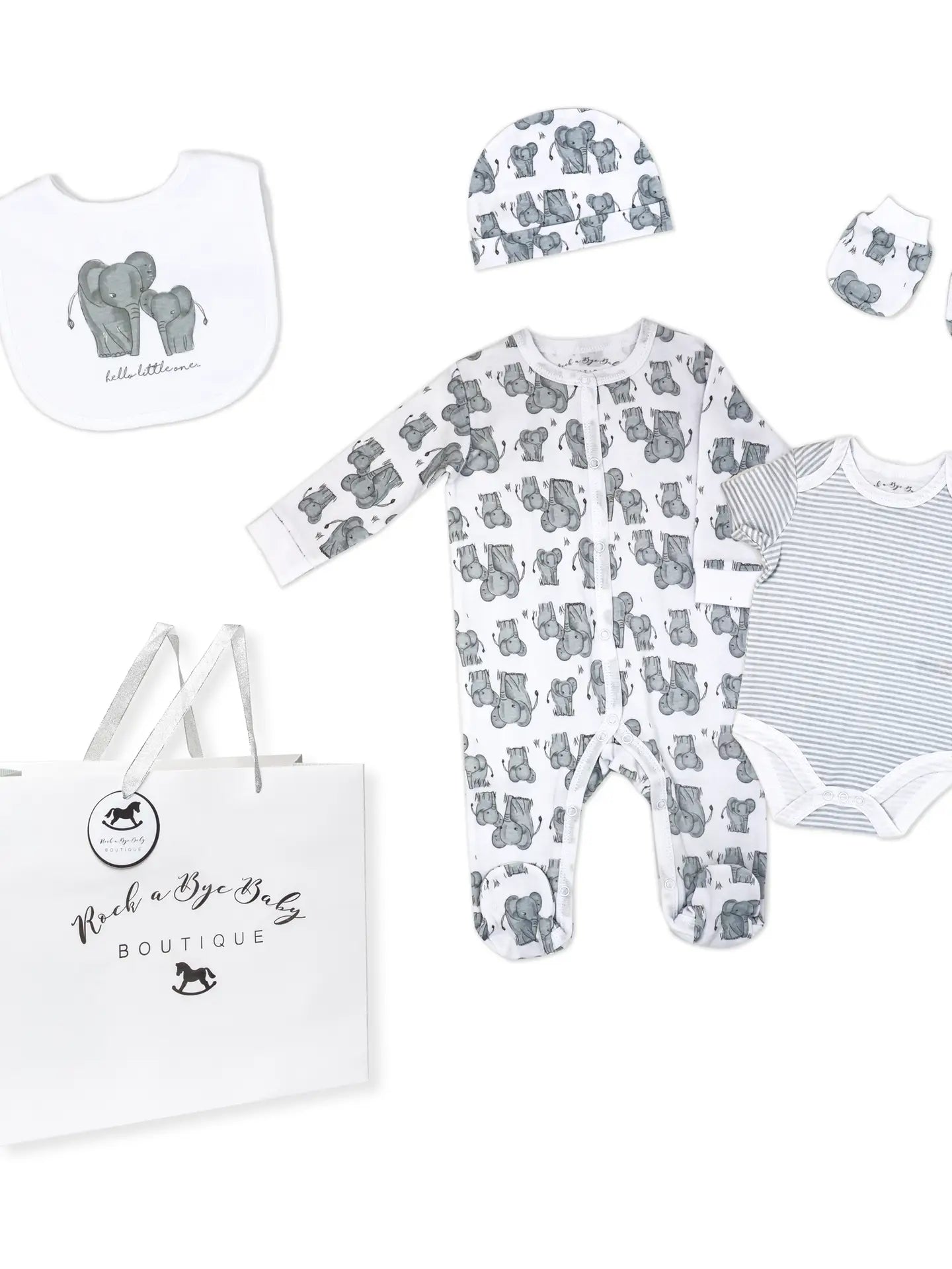 Set includes: Sleeper, Bodysuit, Hat, Mitts, and Bib Packed in Organza Mesh Bag with Gift bag Included