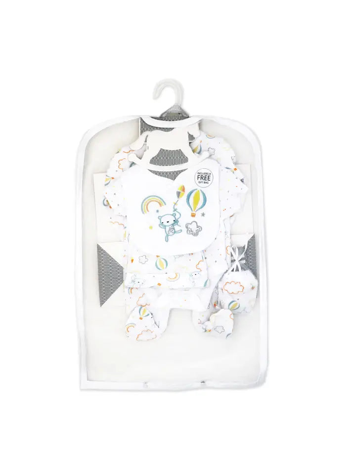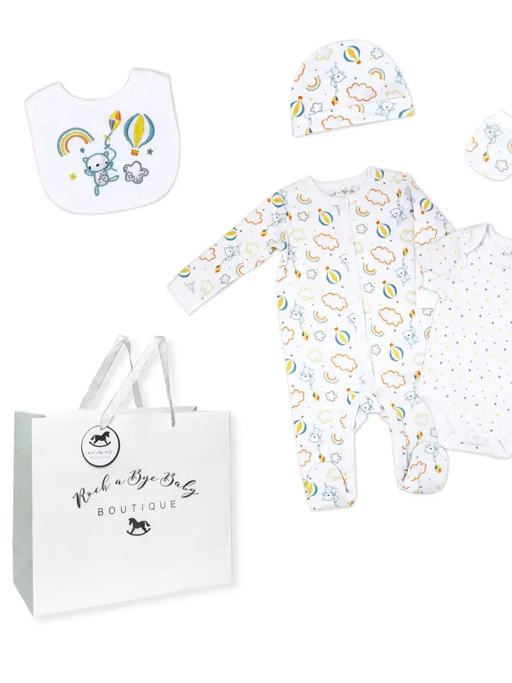 Set includes: Sleeper, Bodysuit, Hat, Mitts, and Bib Packed in Organza Mesh Bag with Gift bag Included