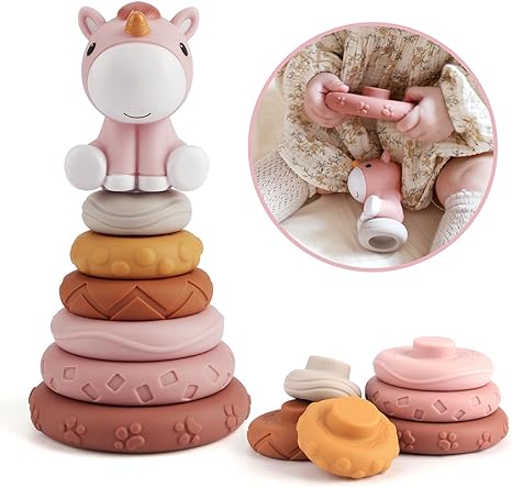 The stacking teething toy has six circles of various sizes and a very cute pink horse on top. The candy-colored appearance and funny sounds can attract baby's attention, and the uneven patterns and patterns on the surface help kids develop their sense of touch. A newborn essentials toy for baby girl and boy!