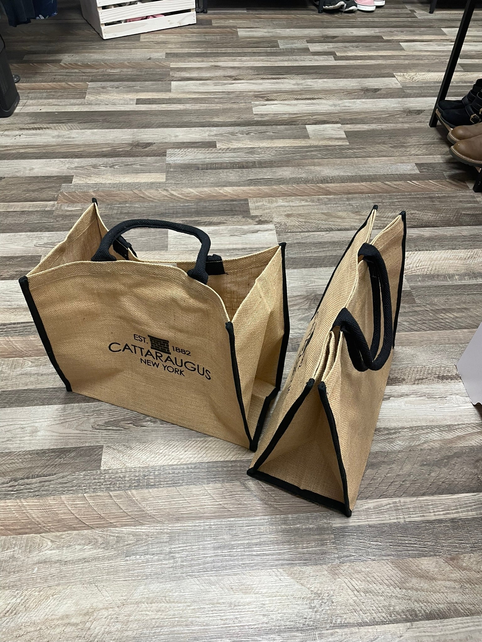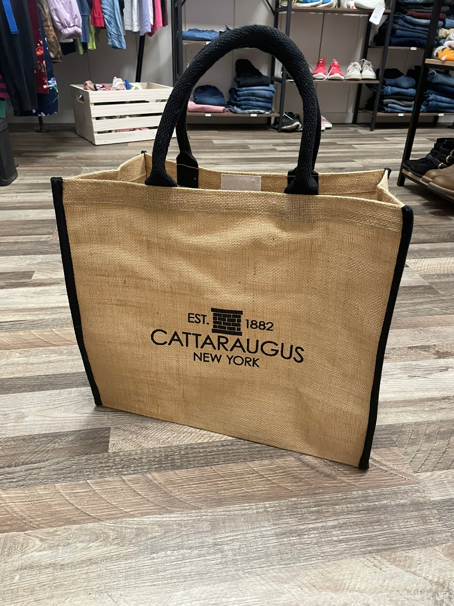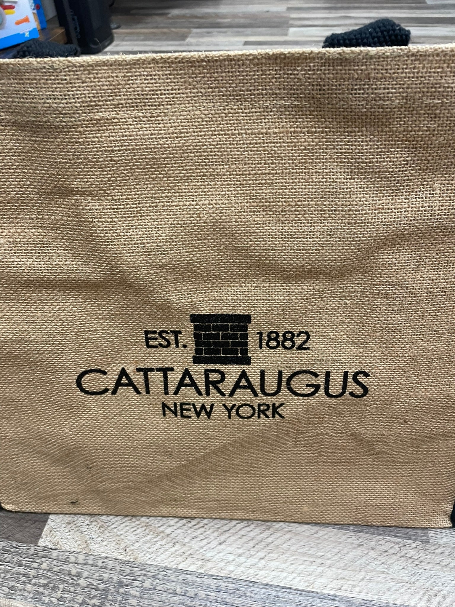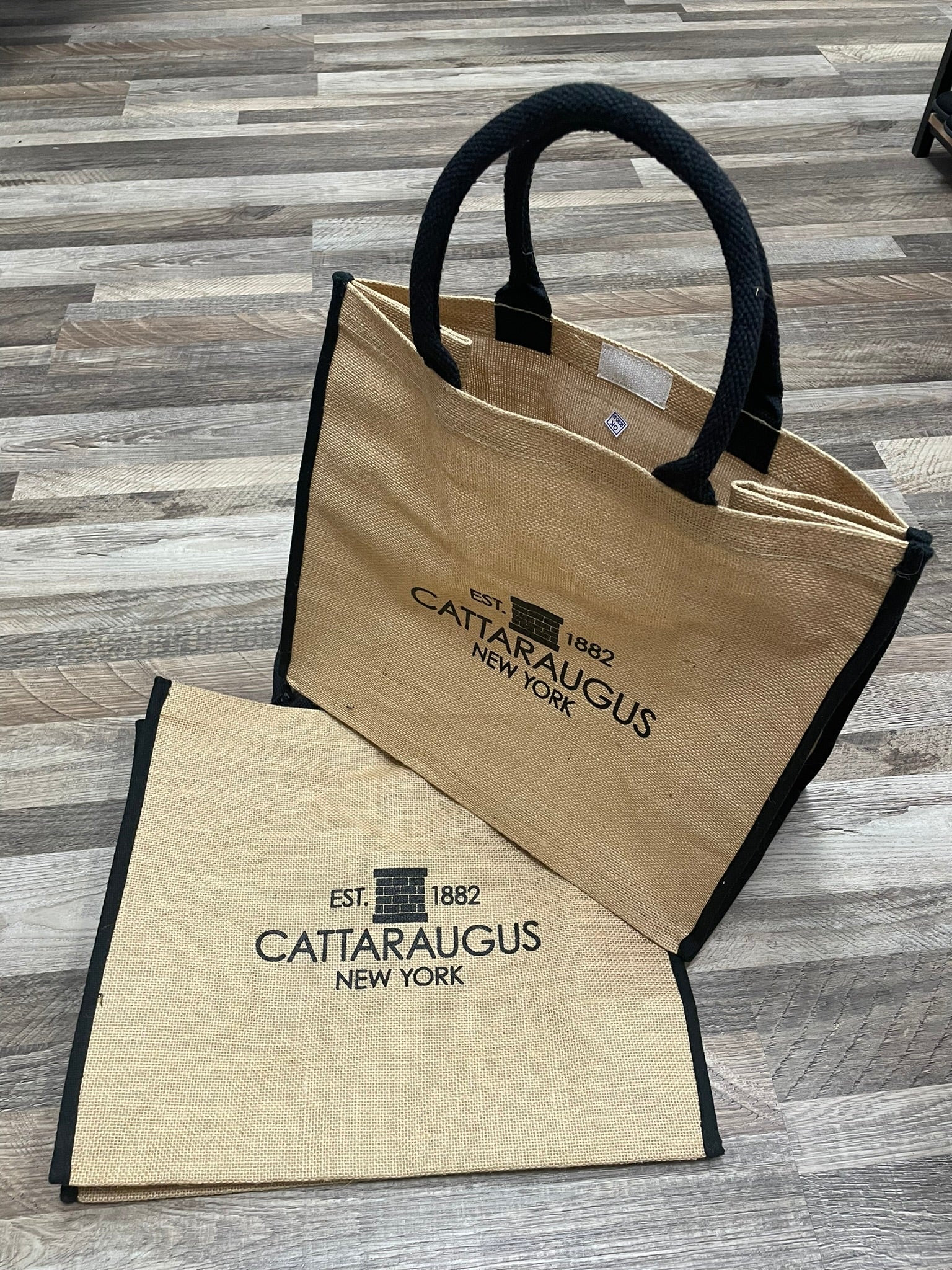 Carry it all in style with this custom Cattaraugus jute tote bag.